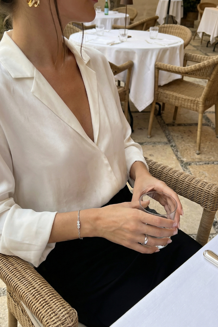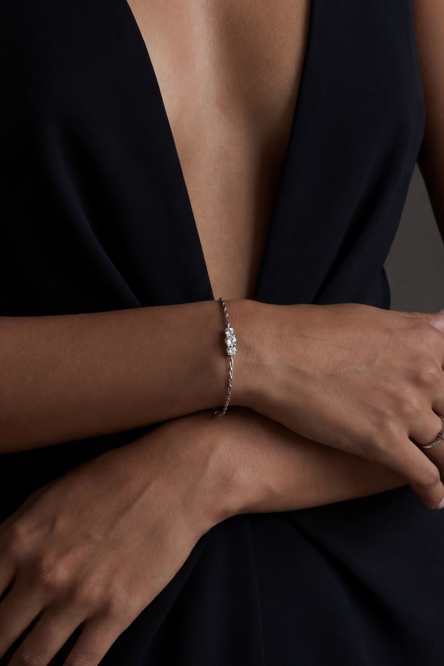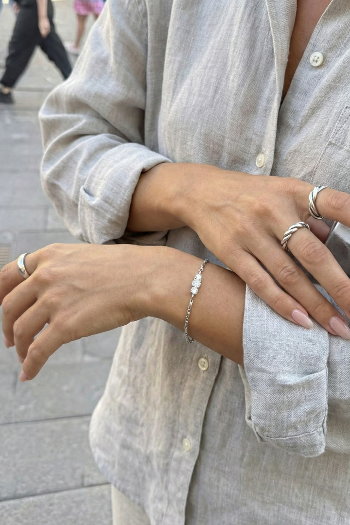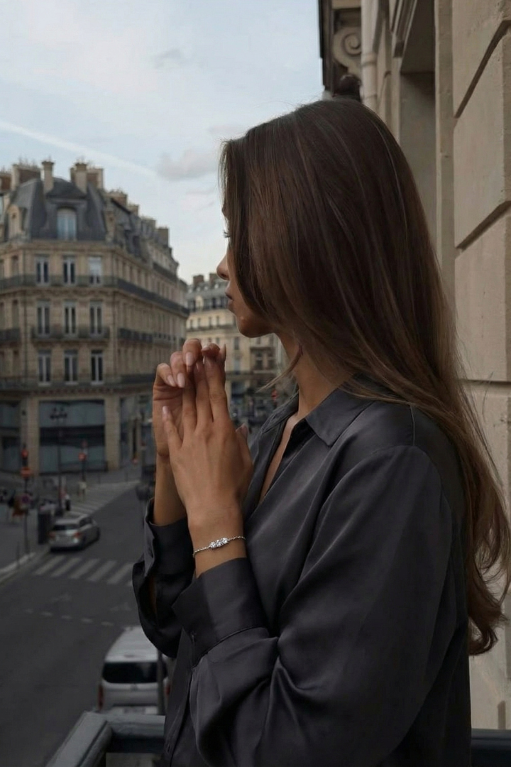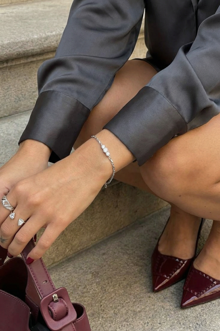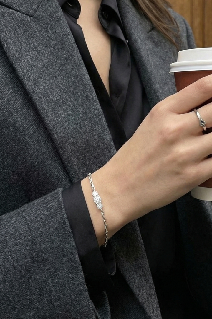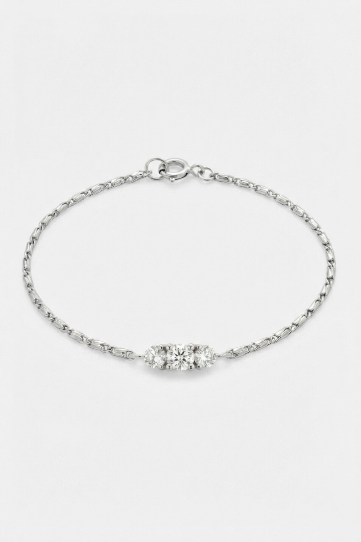 The Triple Stone Bracelet features three precisely set stones aligned in perfect balance, symbolizing harmony and strength. Delicate yet striking, it adds a refined sparkle that feels effortless from day to night.